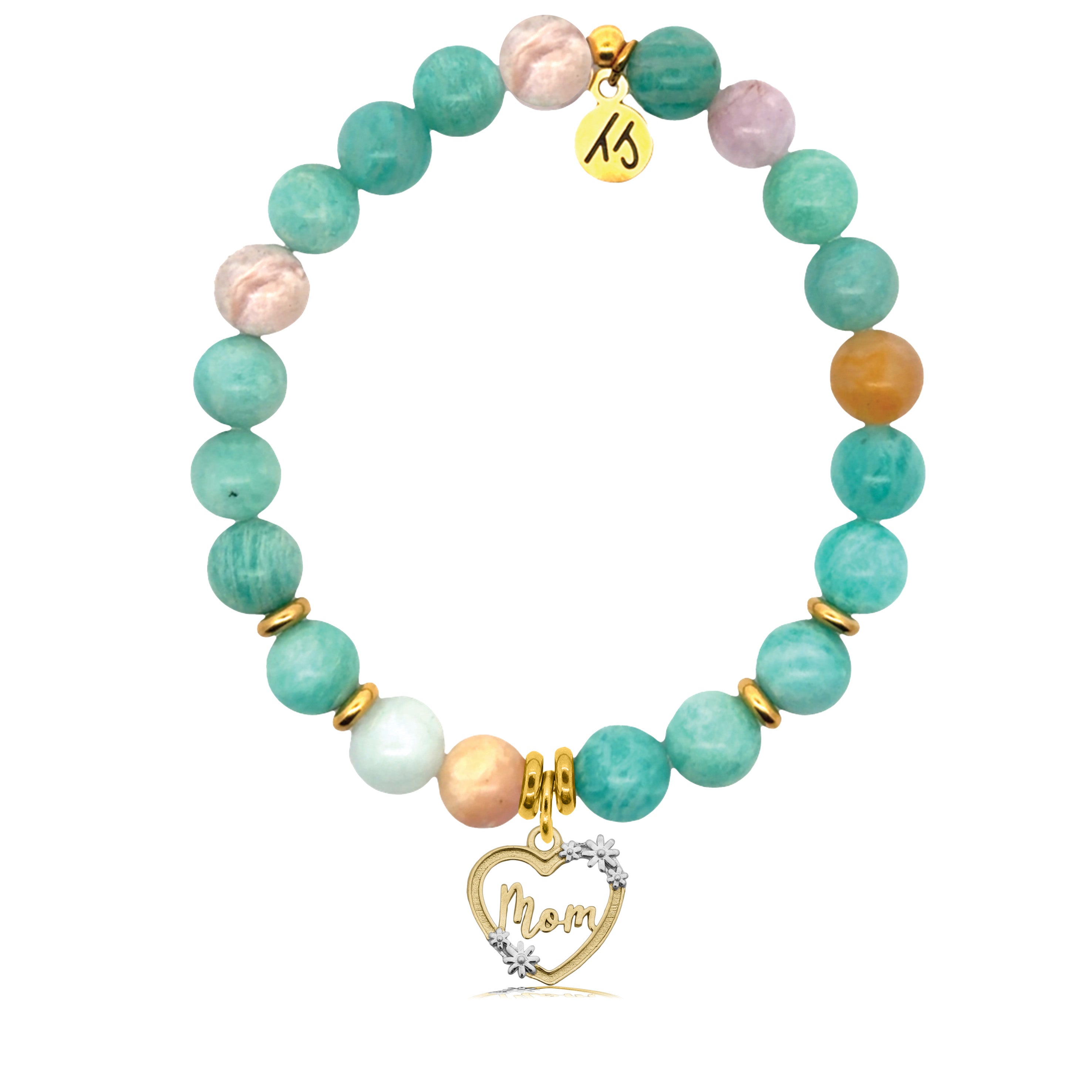 Gold Charm Collection - Multi Amazonite Gemstone Bracelet with Mom Heart Gold Charm