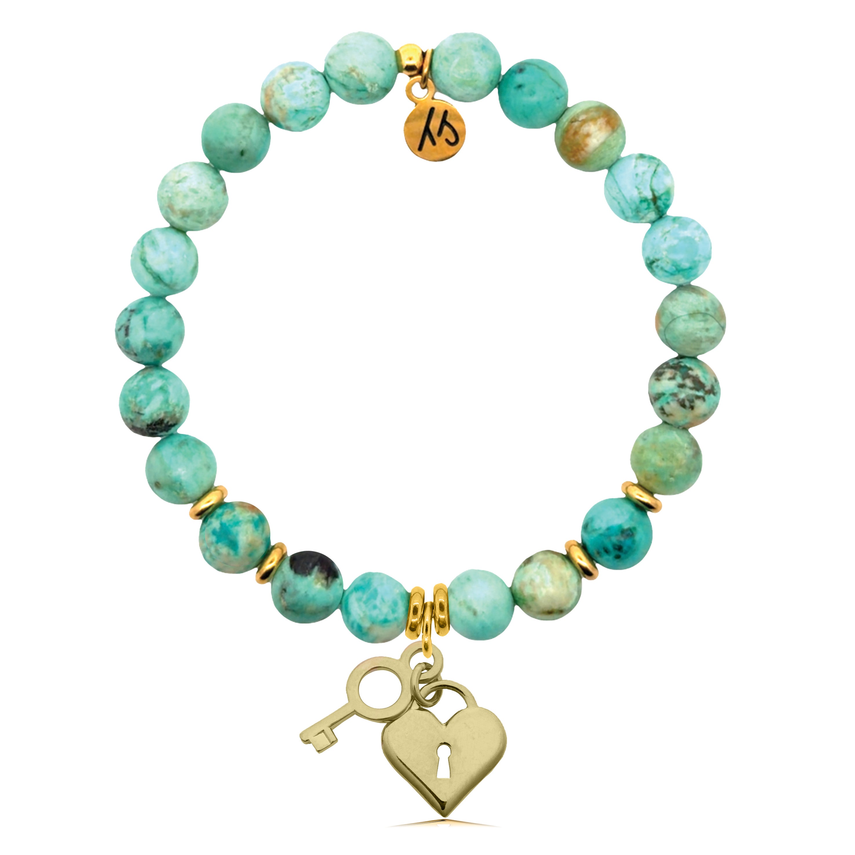 Gold Charm Collection - Peruvian Turquoise Gemstone Bracelet with Key to My Heart Gold Charm