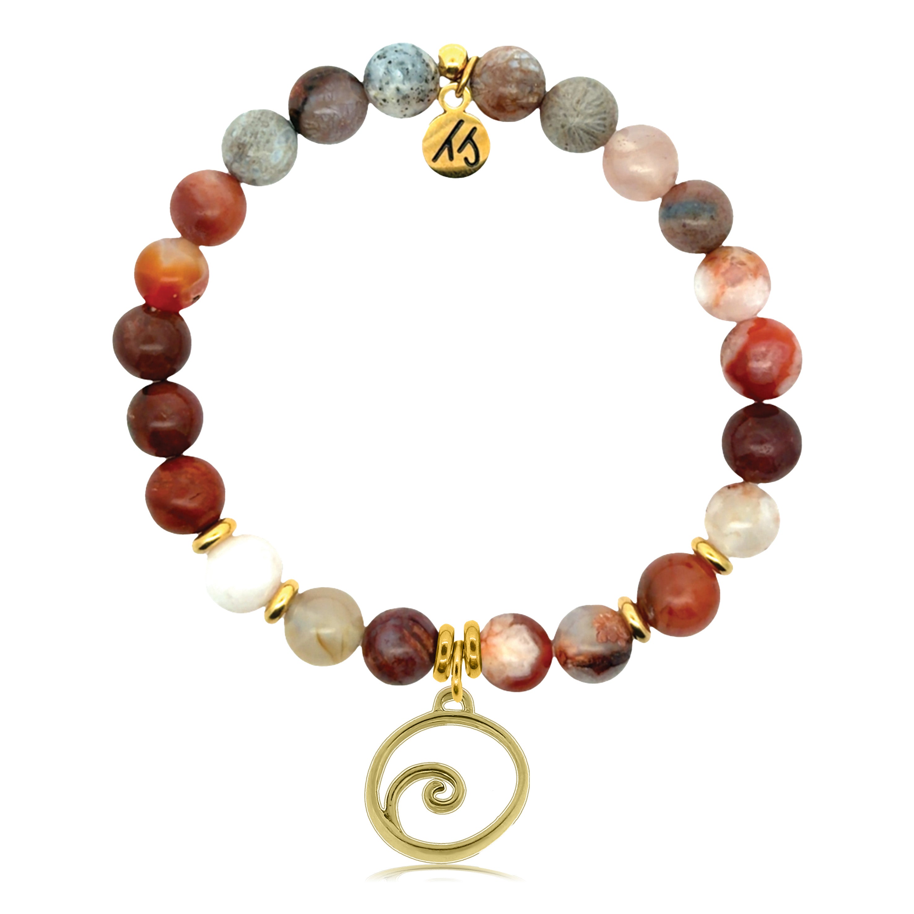 Gold Charm Collection - Sakura Agate Gemstone Bracelet with Wave Gold Charm