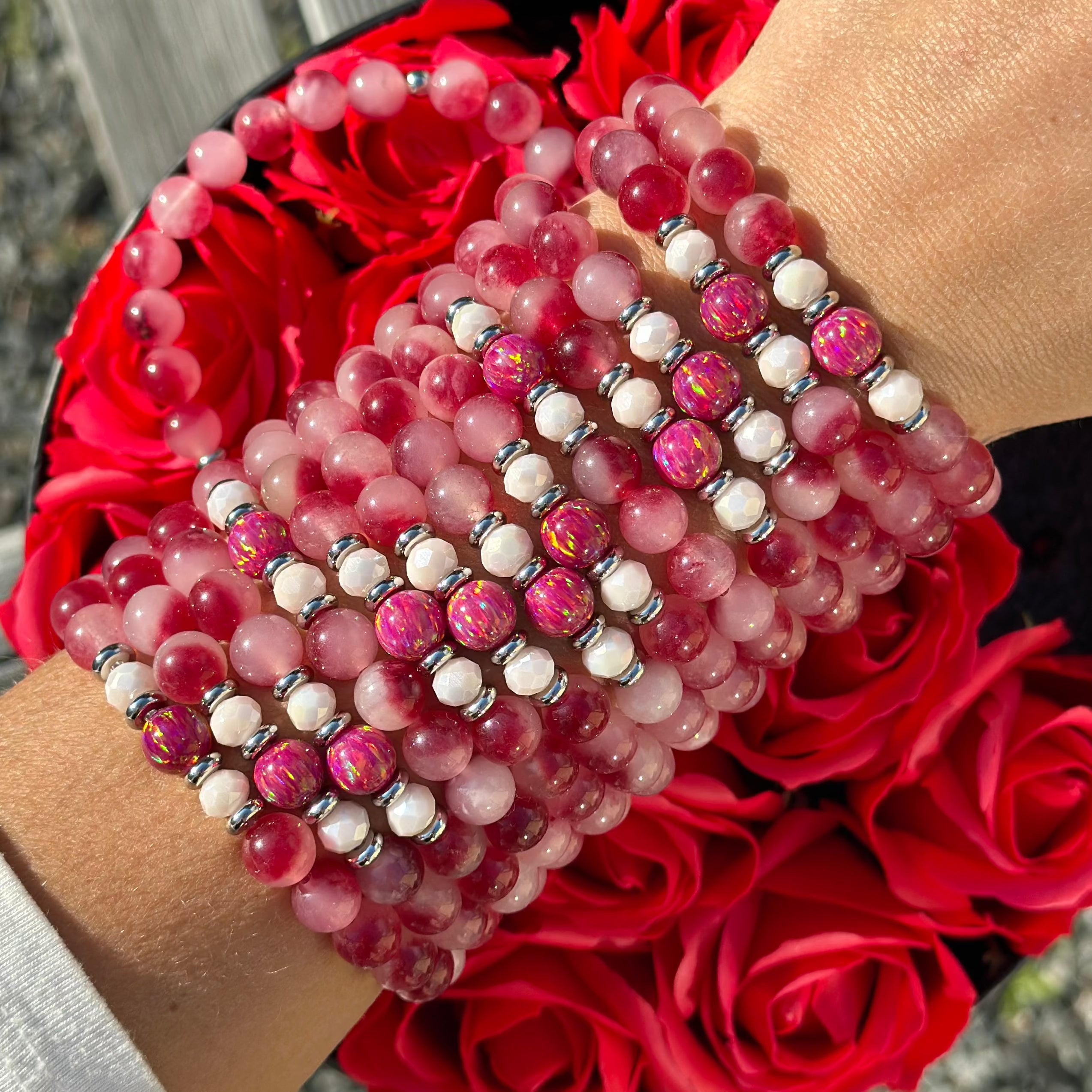 Handcrafted with Cherry Jade gemstone accented with Beige Crystal gemstones and Carmine Opal Centerpiece.