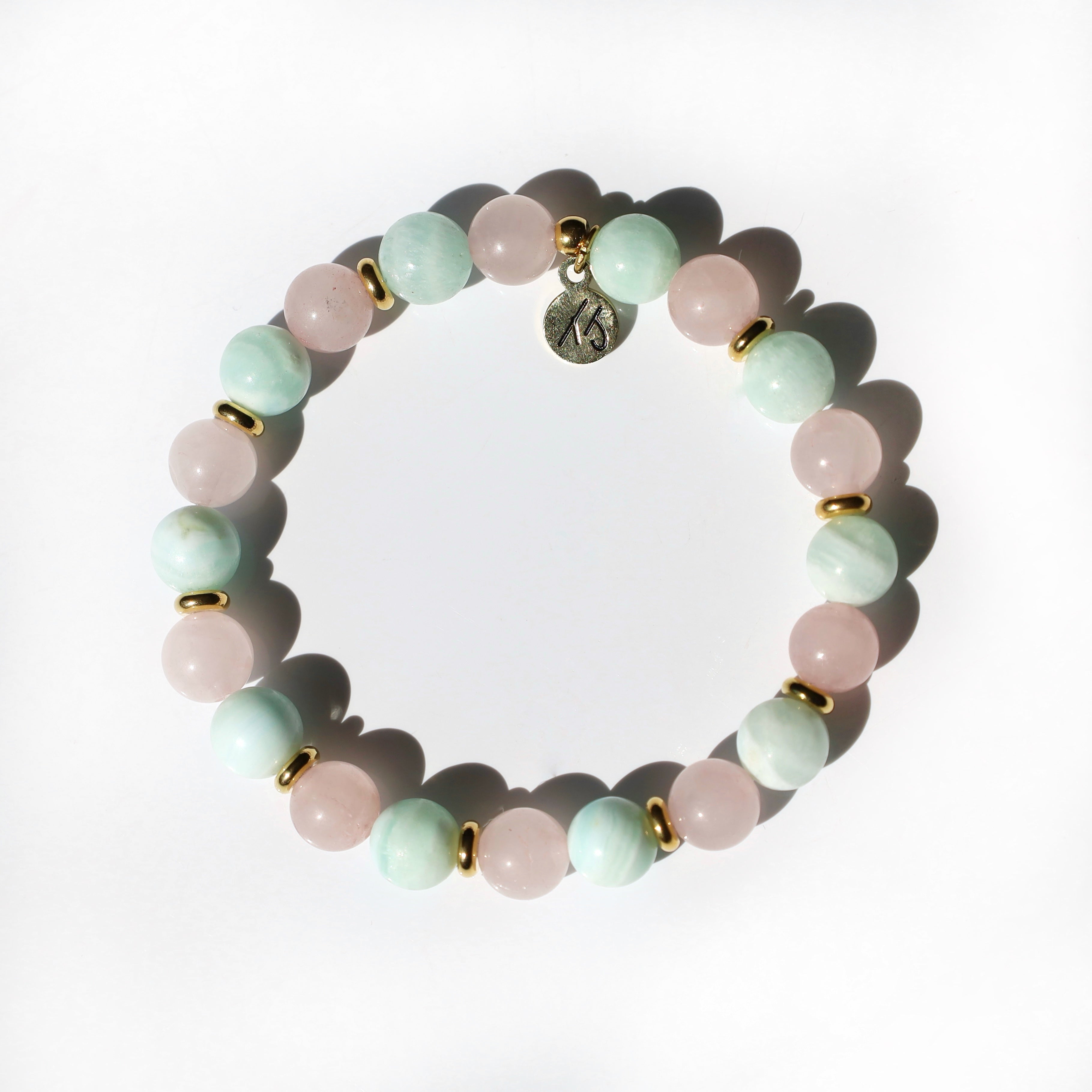 Handcrafted with Rose Quartz & Hemimorphite gemstone accented with gold accents.