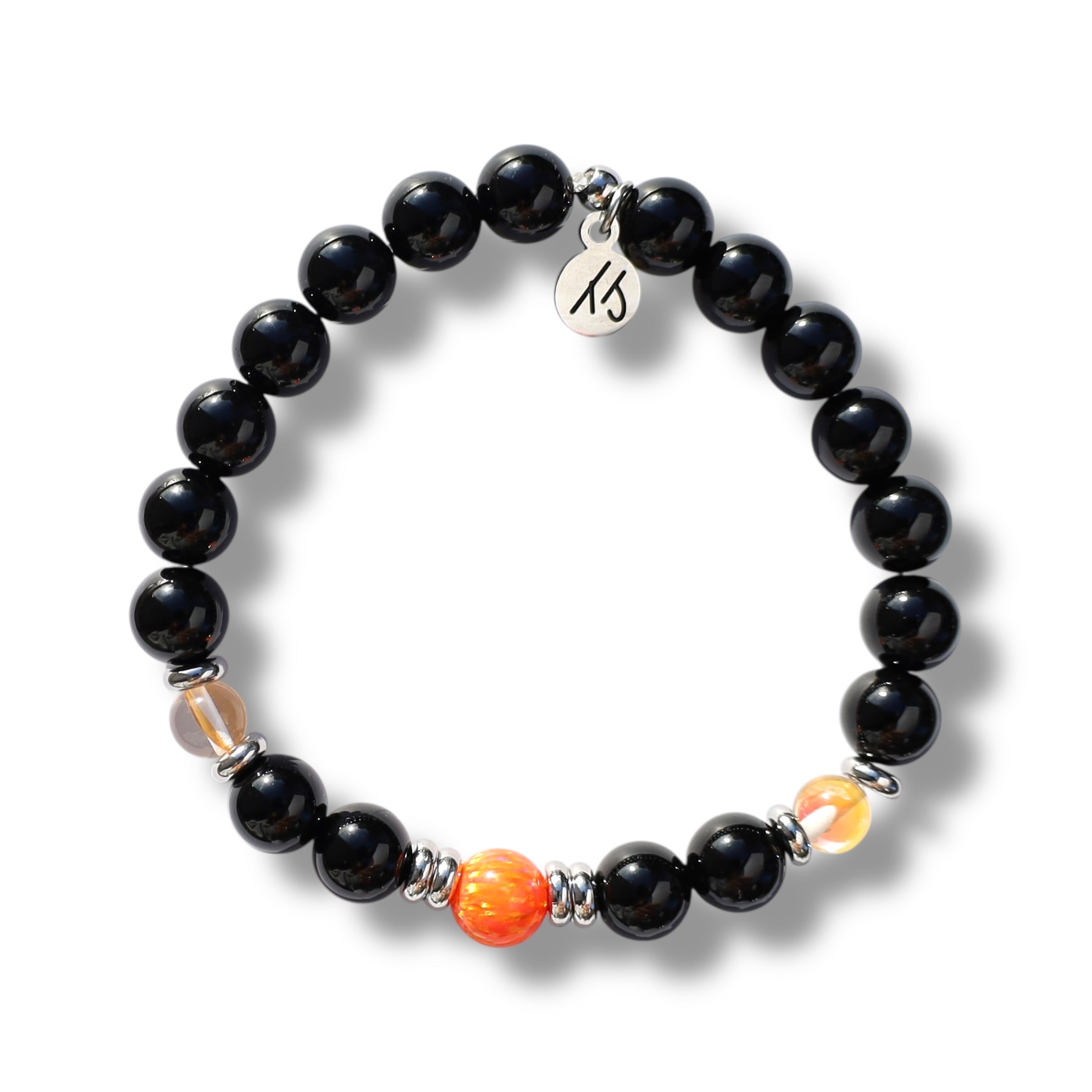 Handcrafted with Onyx featuring Orange Opalescent a Orange Opal centerpiece and Silver accents.