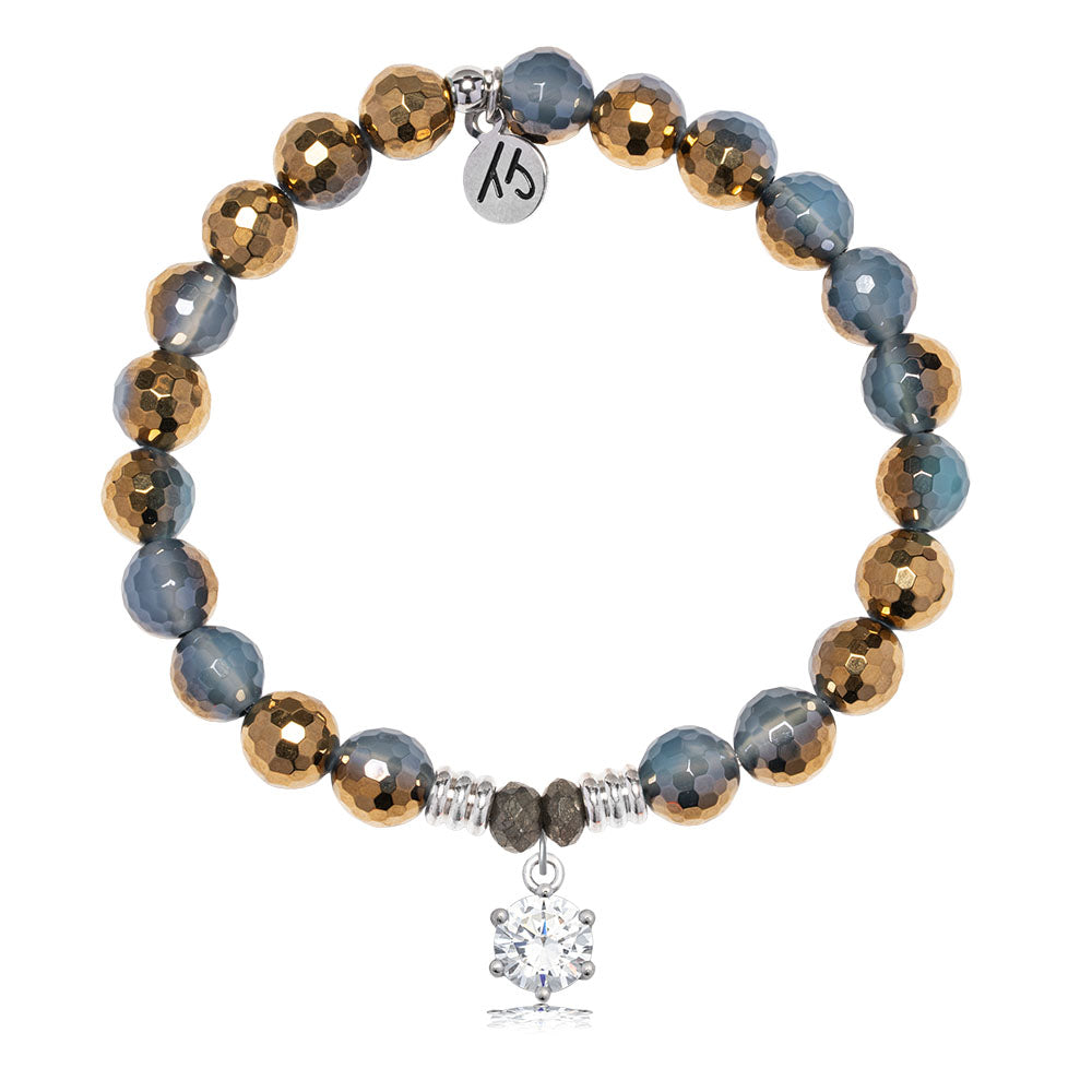 Blue Gold Agate Gemstone Bracelet with Shine Like a Diamond Sterling Silver Charm