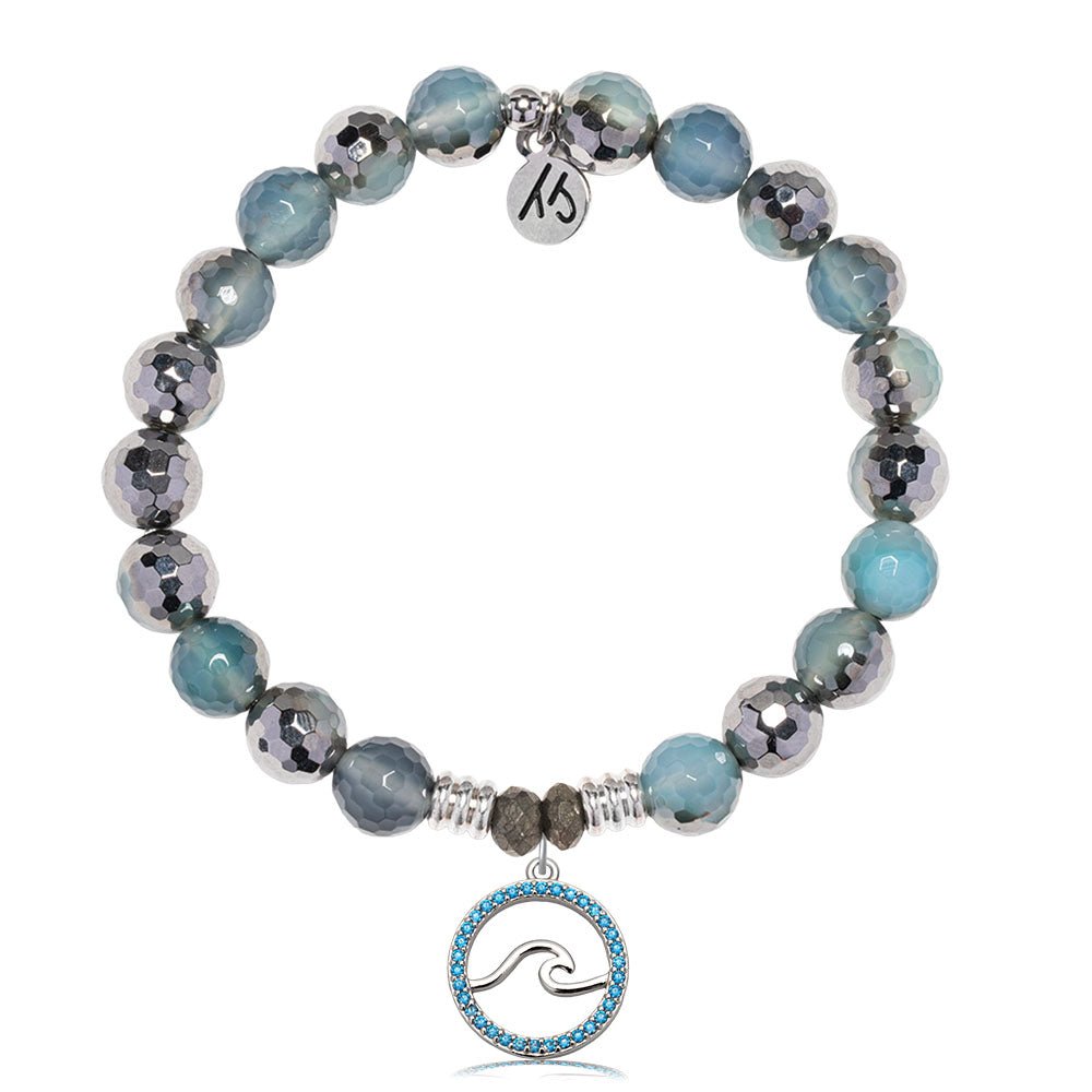 Blue Silver Agate Gemstone Bracelet with Serenity Wave Sterling Silver Charm