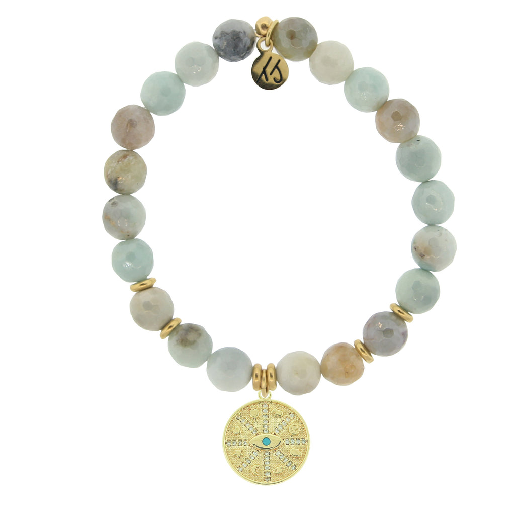 Gold Charm Collection - Aqua Amazonite Gemstone Bracelet with Evil Eye Gold Charm