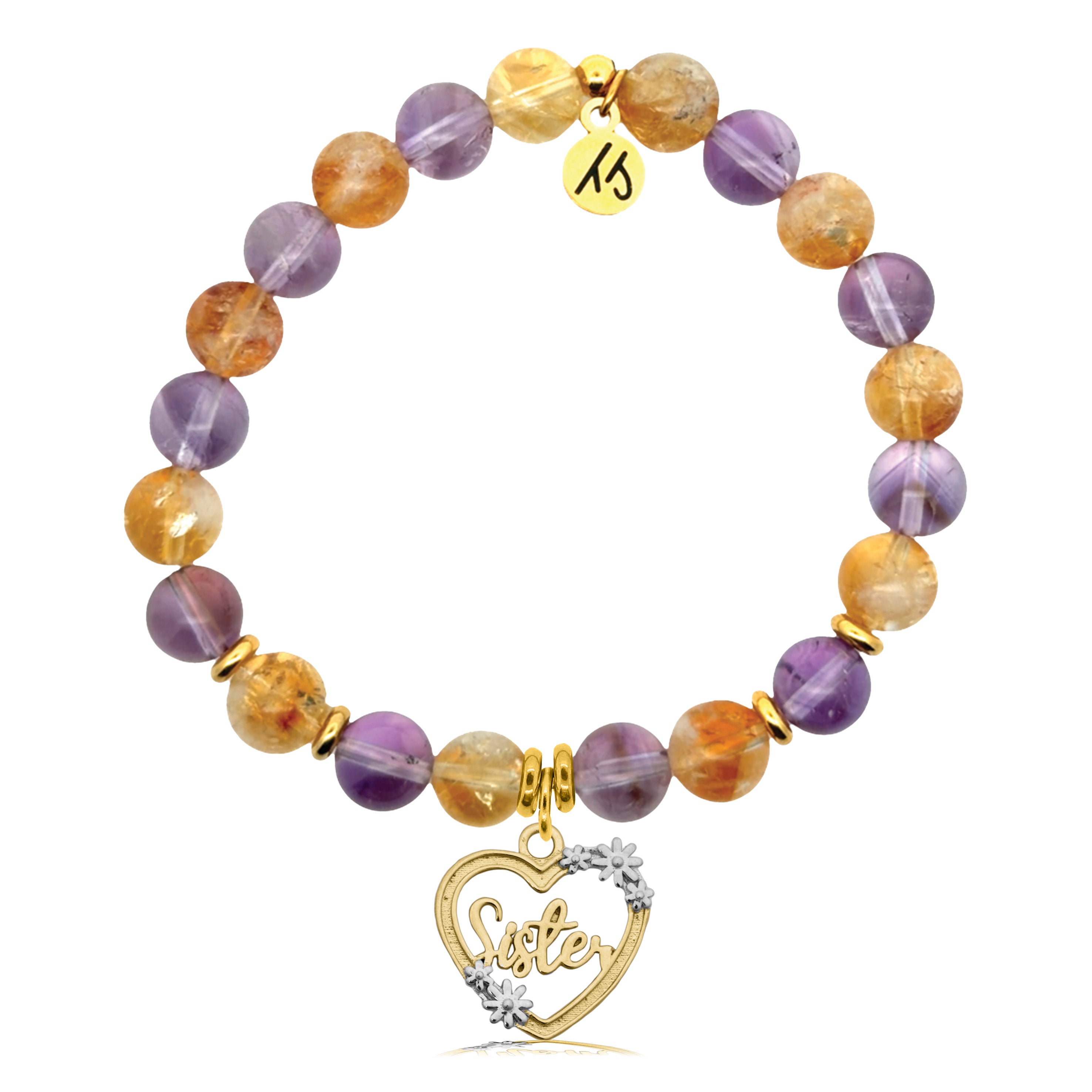 Gold Charm Collection - Amethyst Citrine Gemstone Bracelet with Sister Heart Gold Charm