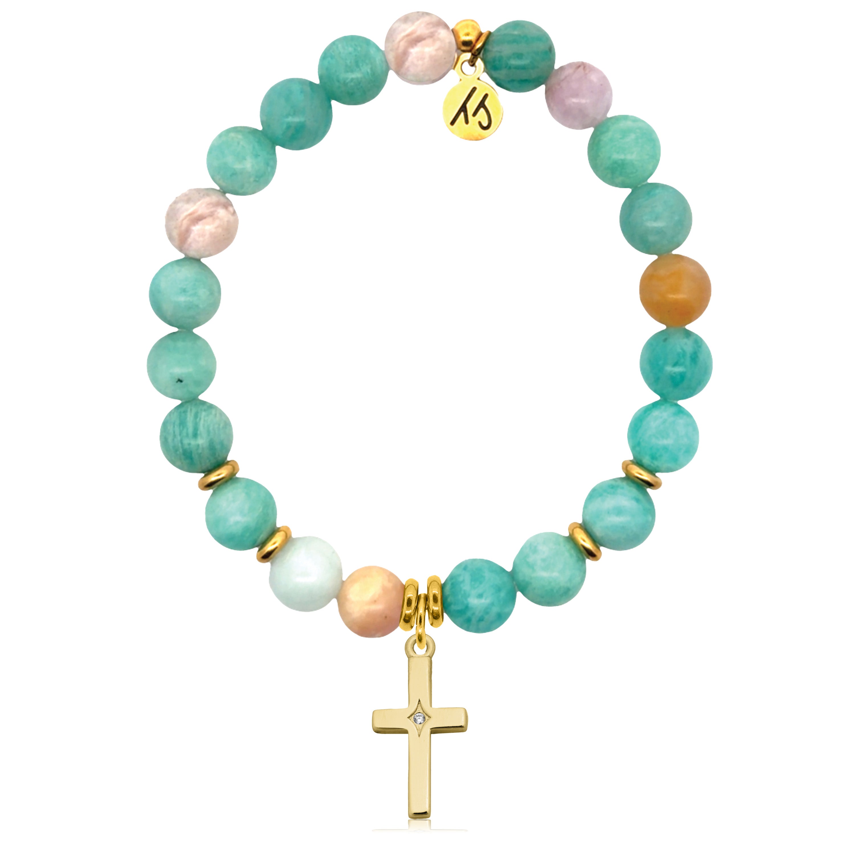 Gold Charm Collection - Multi Amazonite Gemstone Bracelet with Cross CZ Gold Charm