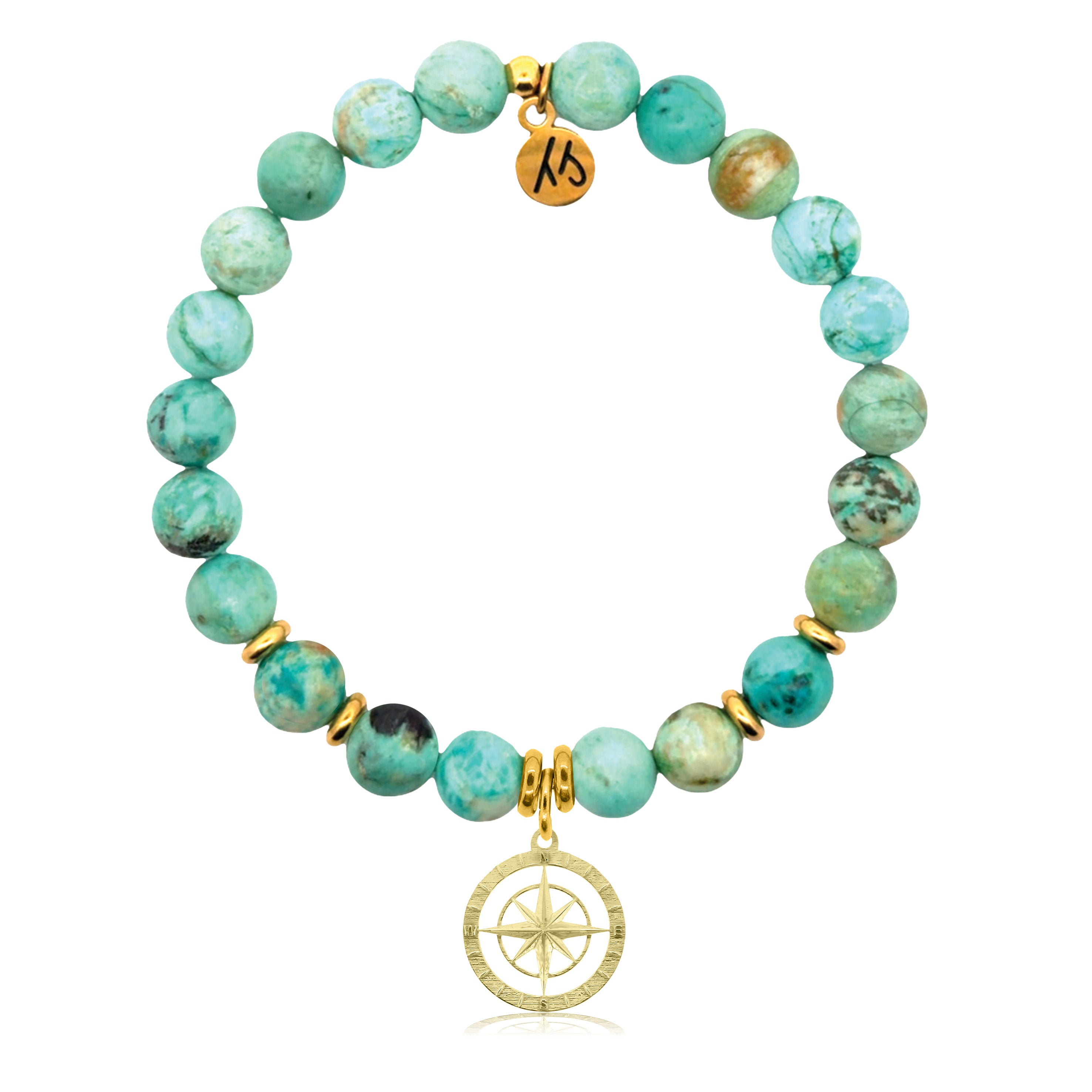 Gold Charm Collection - Peruvian Turquoise Gemstone Bracelet with Compass Rose Gold Charm