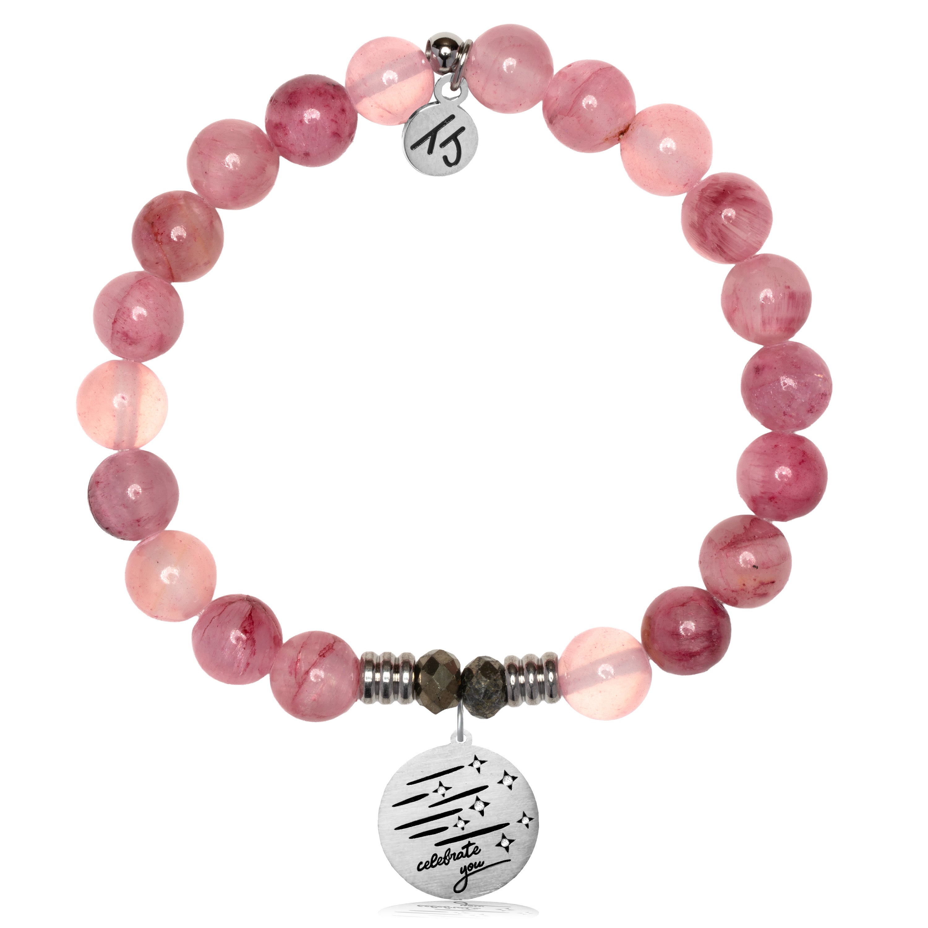-Each beaded Pink Calcedony Handmade charm bracelet is accented with two Pyrite stones worn to bring good luck and good fortune to the charm bracelet wearer.