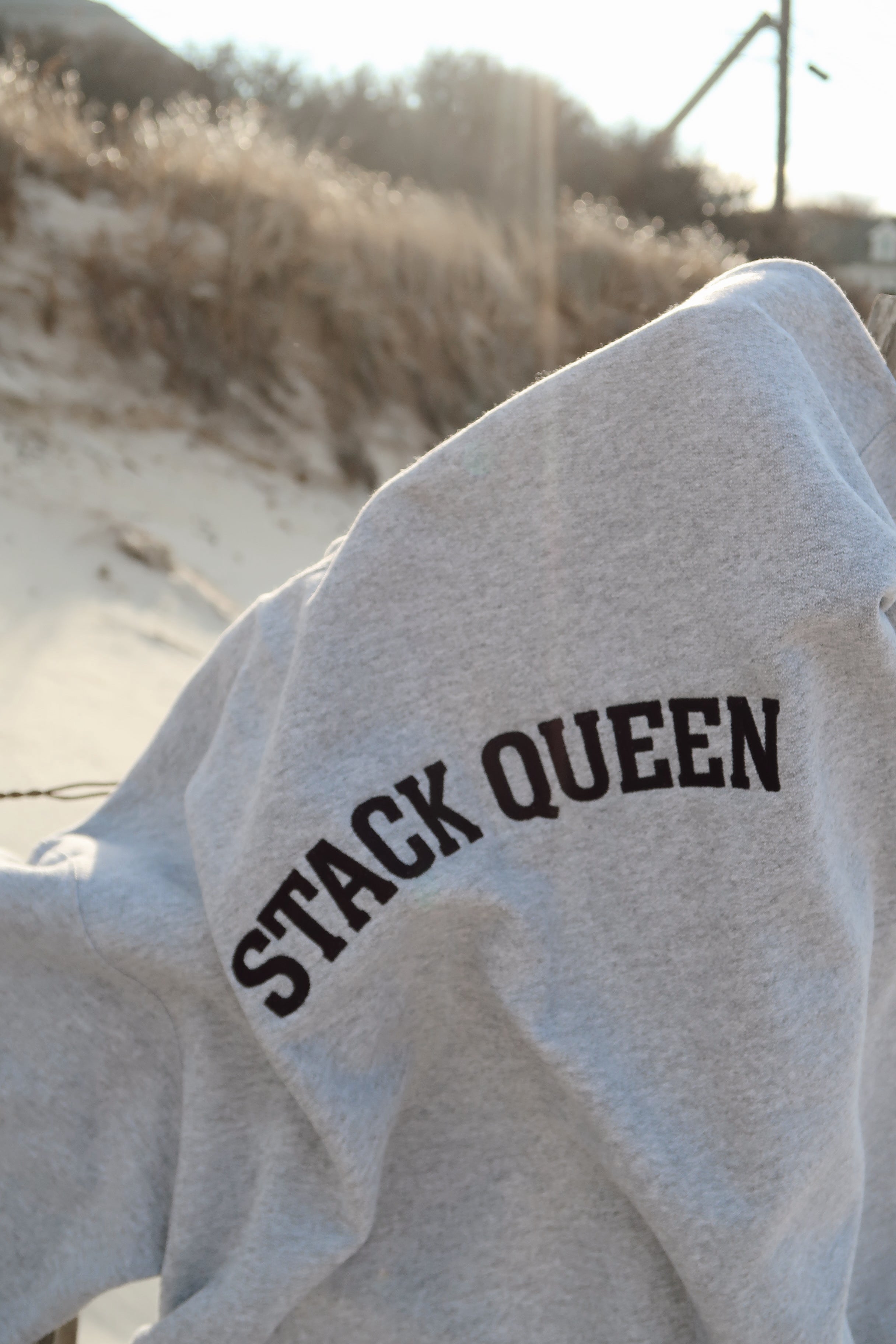 Light Grey crewneck With embroider "STACK QUEEN" patch with Black text