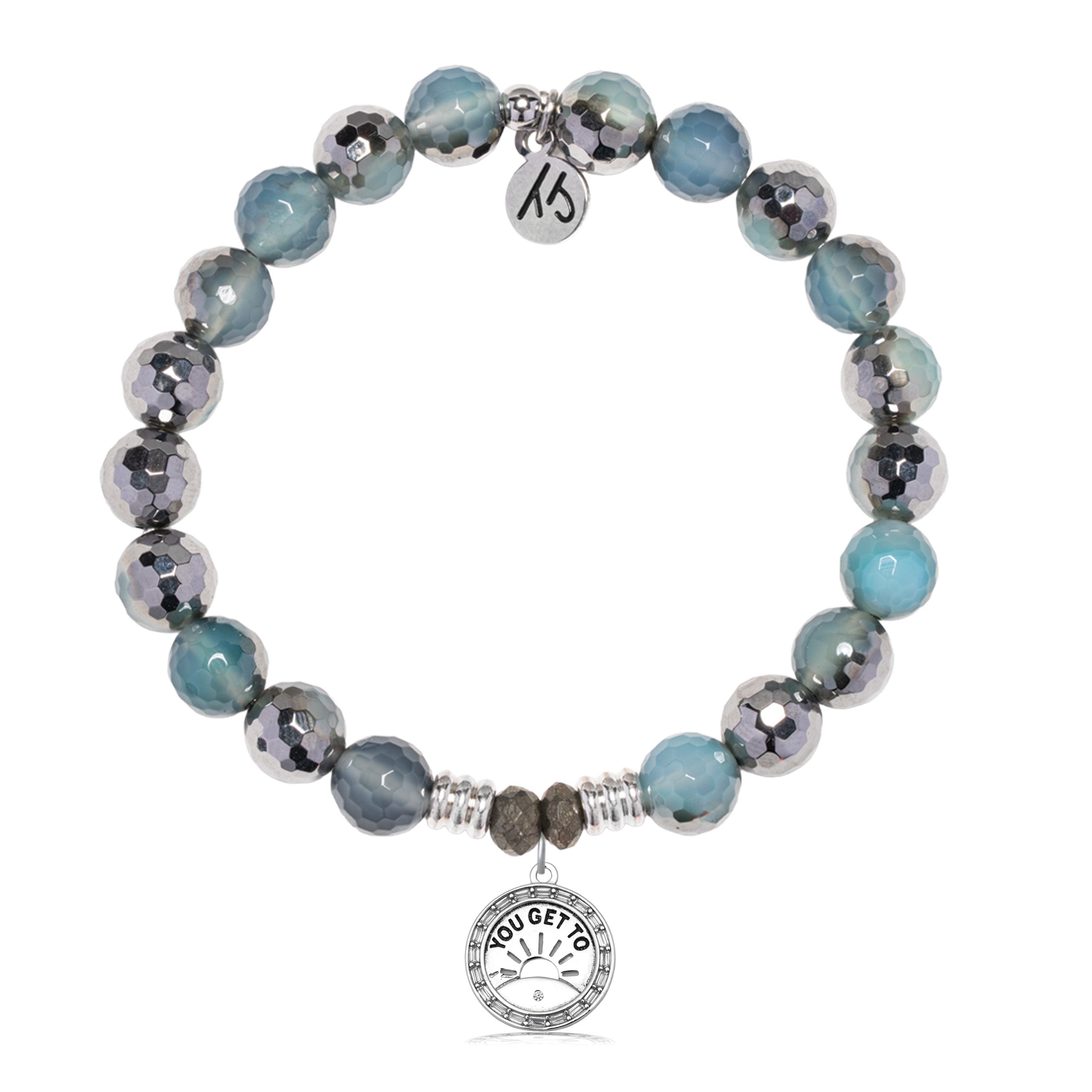 Blue silver agate has a smokey blue stone with a beautiful sparkle to it. It Pairs perfectly with the you get to charm, which has little crystals around the outer edge. Uniquely designed and I love it.