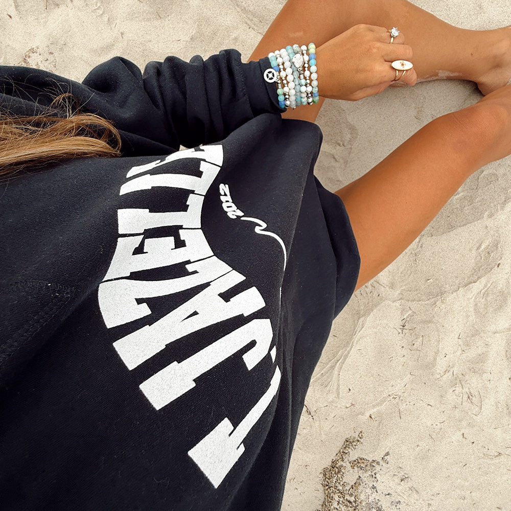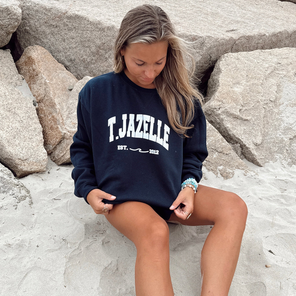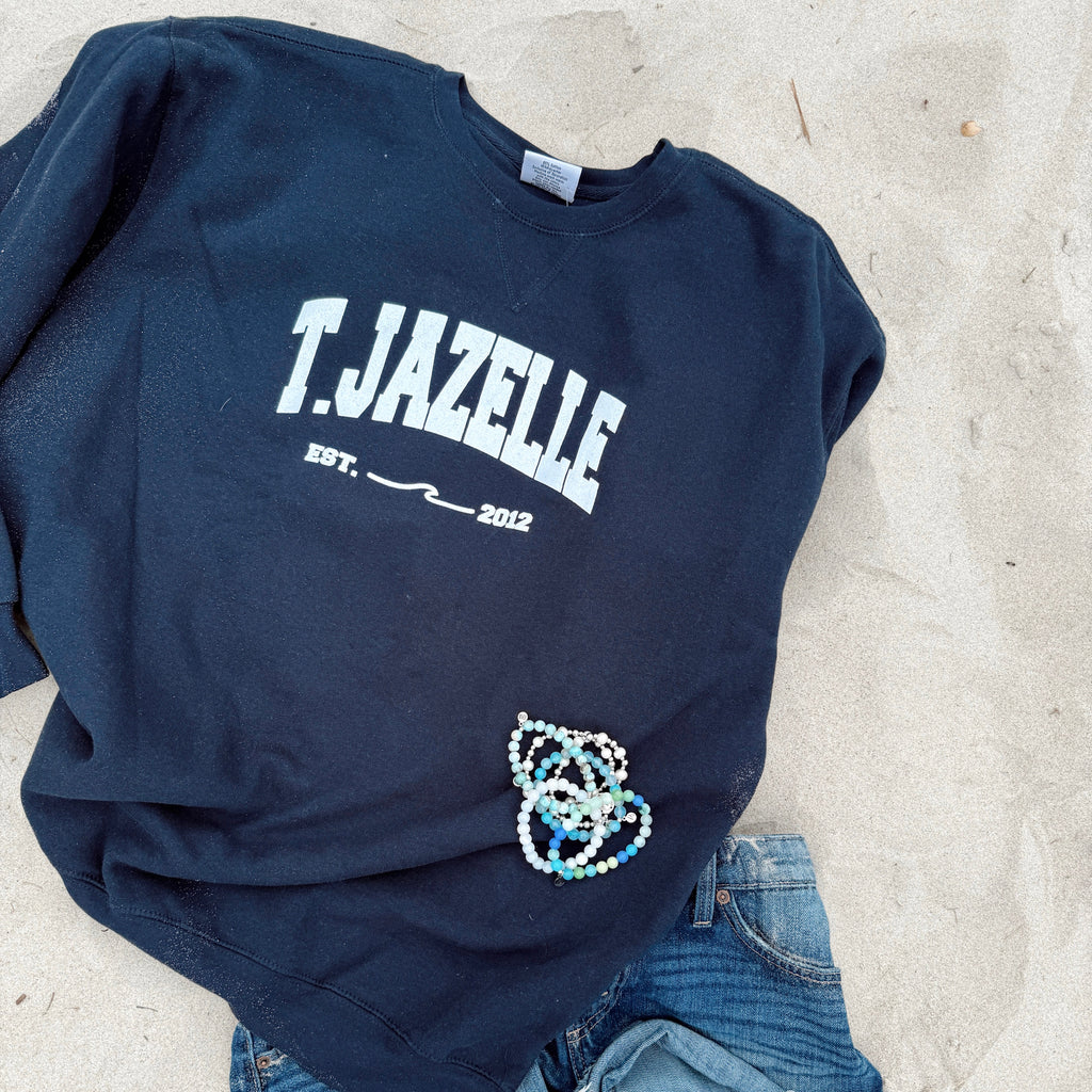 A fan favorite returns! Our iconic T. Jazelle crewneck is back by popular demand. Featuring block T.JAZELLE lettering and our signature wave design. This timeless piece blends comfort with coastal style, making it the go-to layer for beach days, bonfires, and everyday adventures. Soft, relaxed, and effortlessly cool—just like the T. Jazelle vibe you love.
