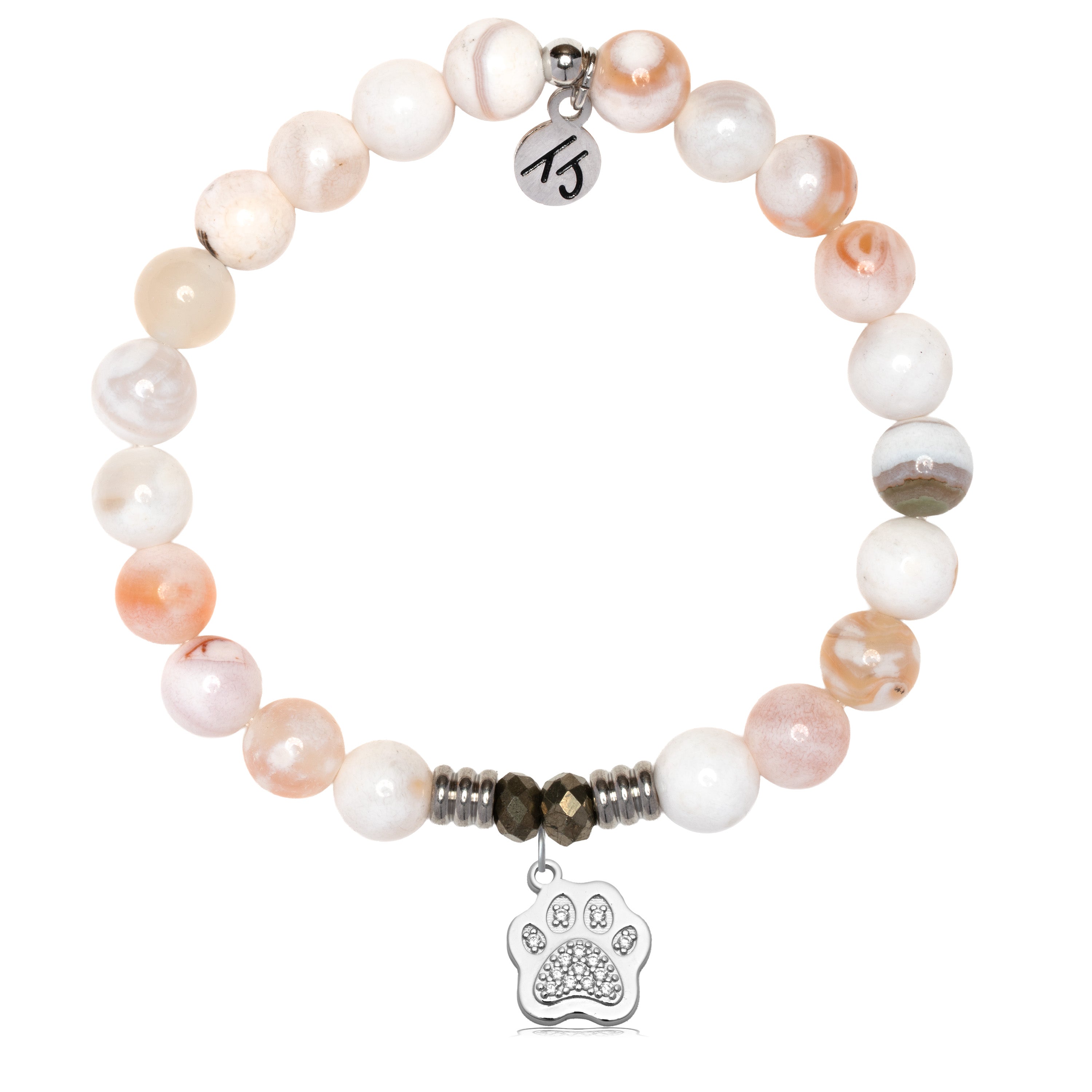 White Natural Agate Gemstone Bracelet with Paw CZ Sterling Silver Charm